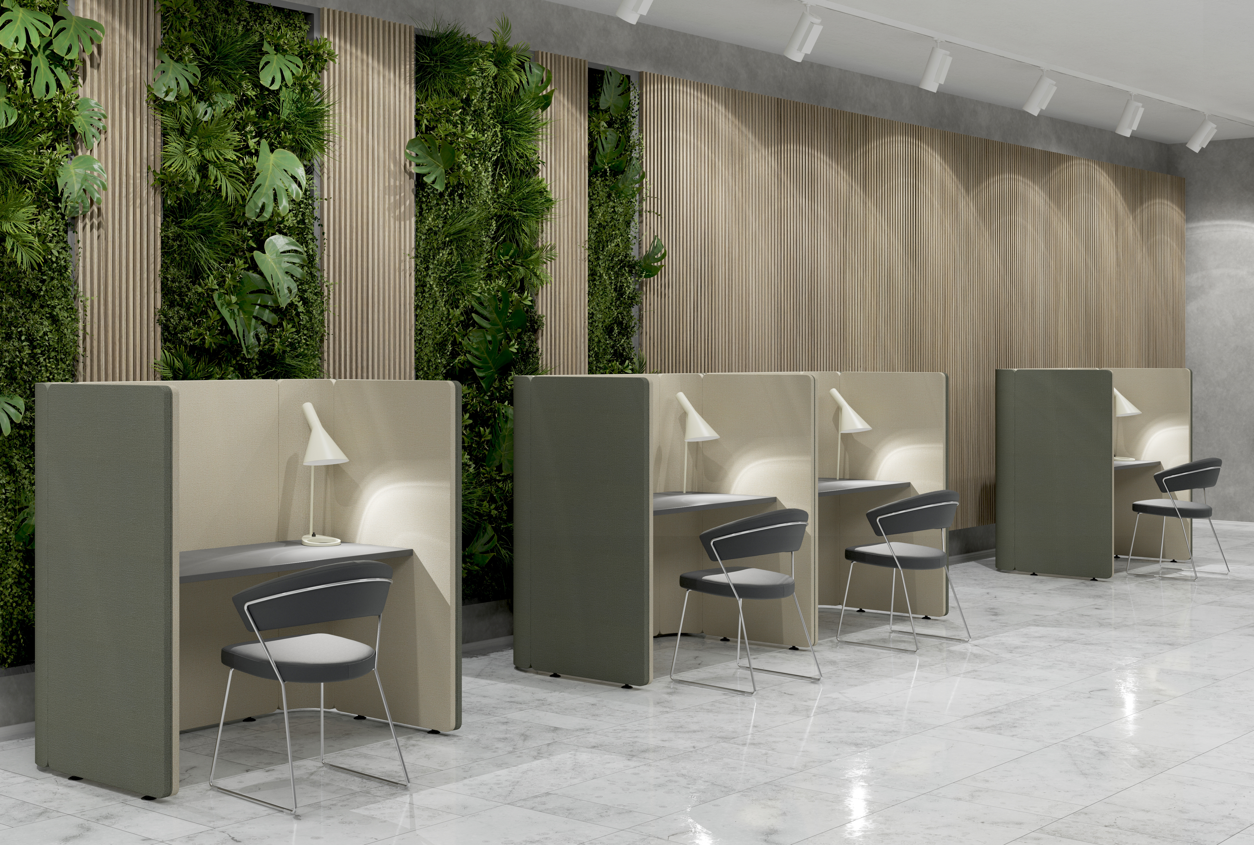 The single person booths can have heightened glass inserts toenhance the acoustic performance of the booth & to provide that extra little bit of privacy.